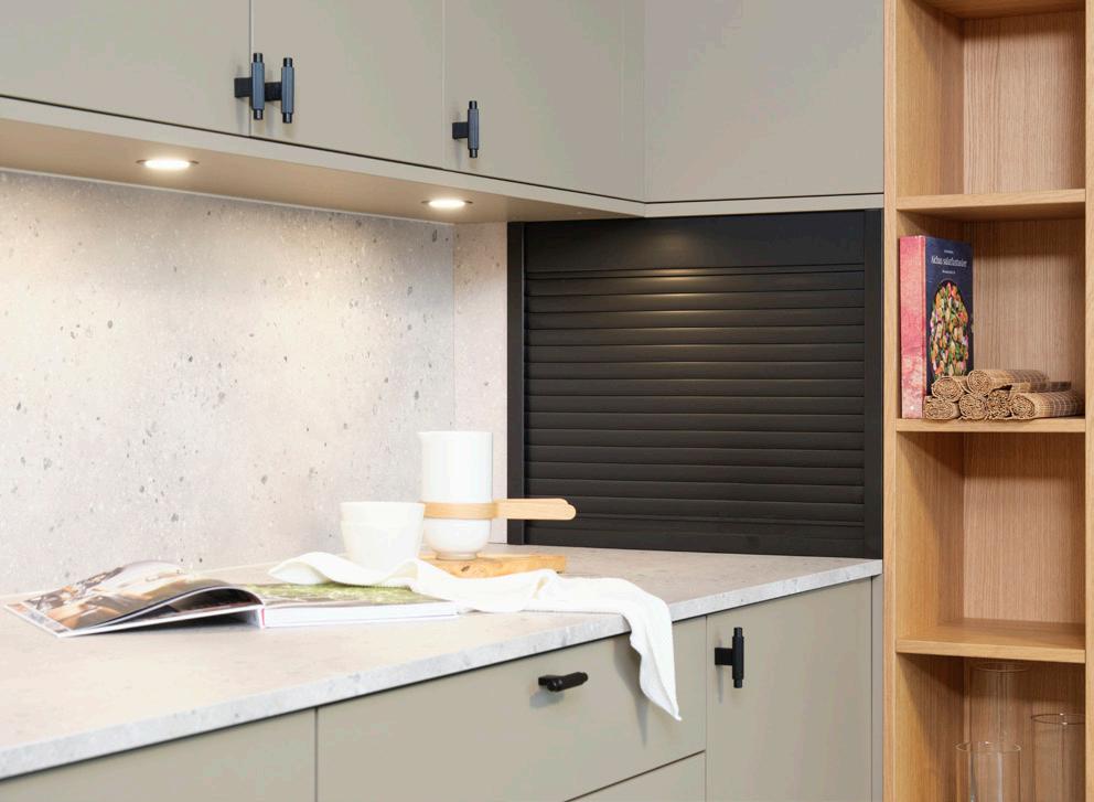 Skap fargeharmoni på kjøkkenet med Pietra Fanano Light Grey og en underlimtsilgranittvask, Blanco Dalago 6, kaffe.