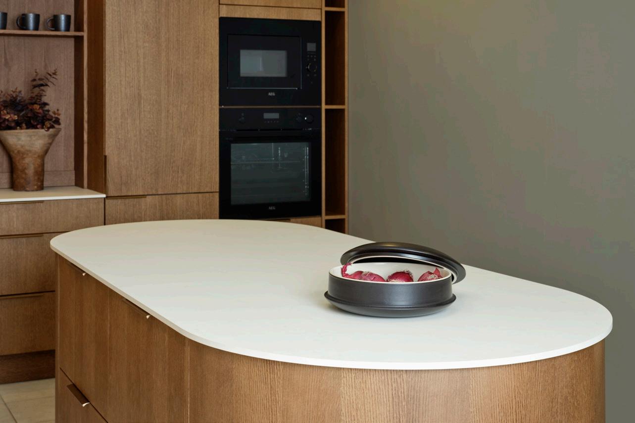 Den voksede Osmo- overflaten på kjøkkenøyen i eik bringer frem naturlig skjønnhet. En fingerskjøtt bro gir den gode følelsen av det fineste håndverk.