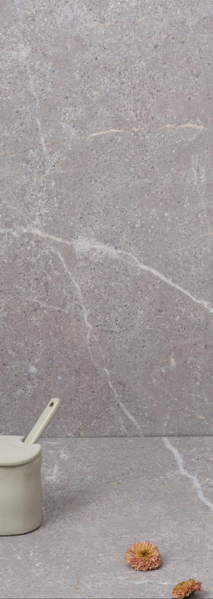 Bellisara Stone Light Grey med sin subtile stendekor og greige fargenyanser flyter harmonisk sammen, ispedd diskré korte årer som beveger seg mot hvitt.