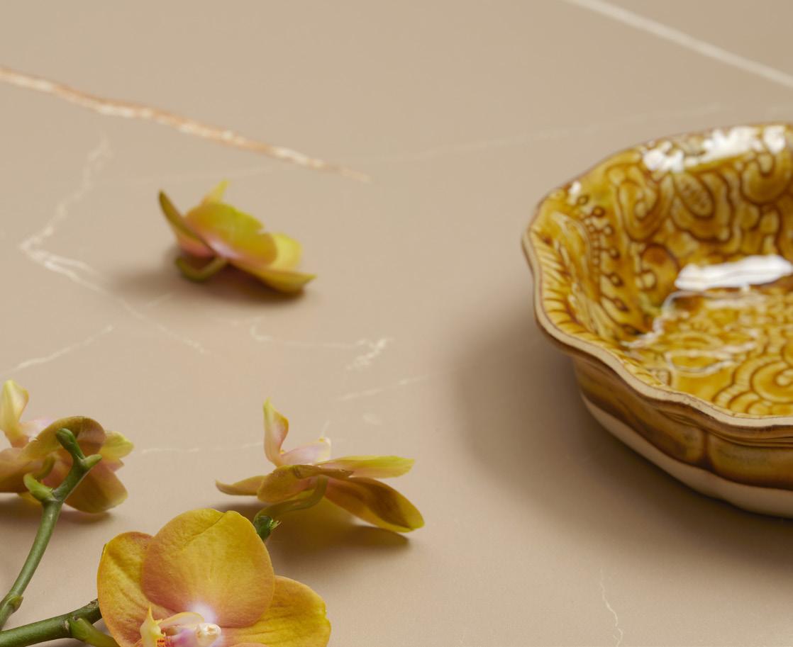 Tilbehør i messing eller gull harmoniserer perfekt og trekker frem de forfinede gullårene i benkeplaten.