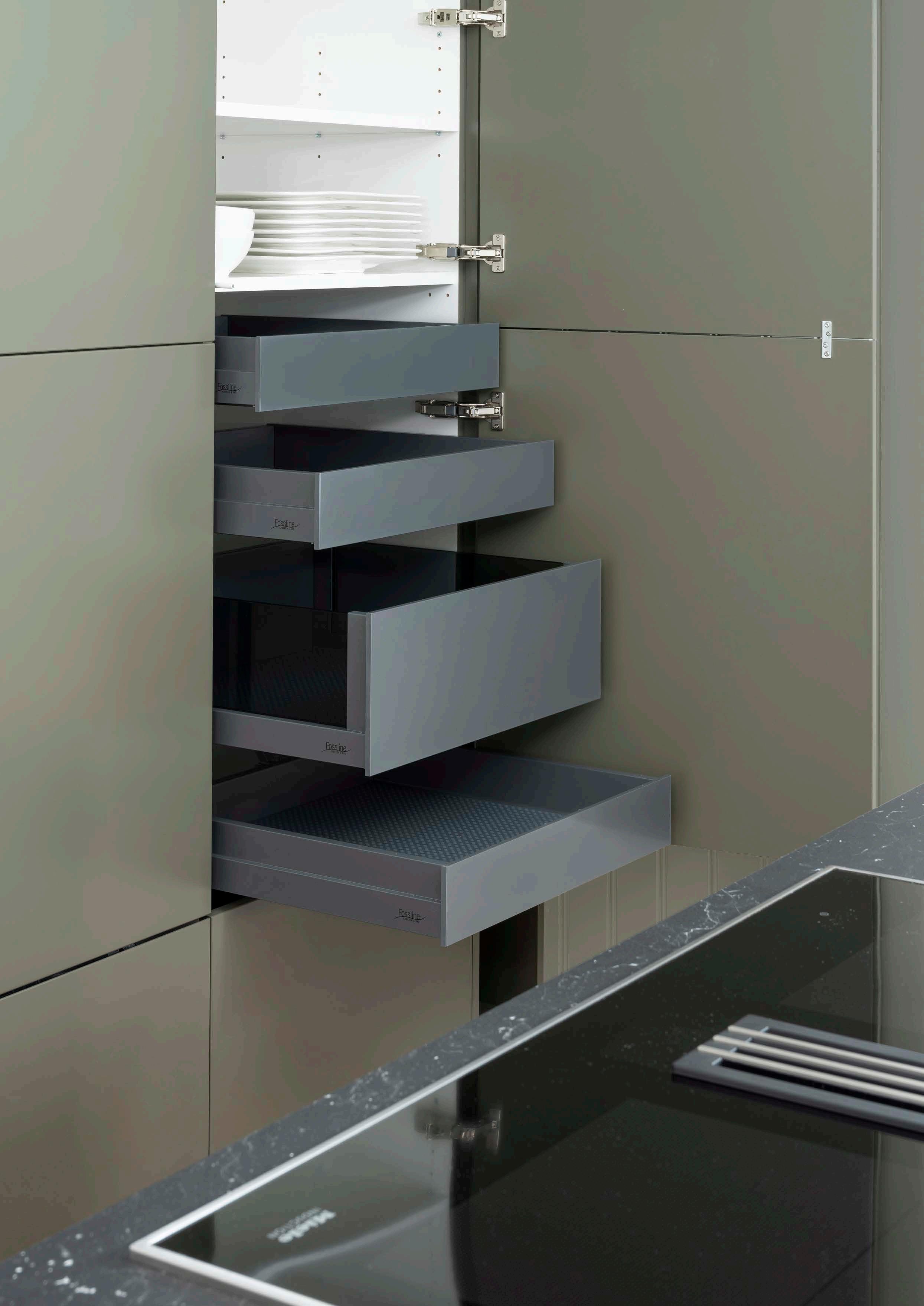Du kjenner følelsen. Hendene er fulle og du skulle så gjerne ha åpnet skuffen. Med elektrisk motor eller mekaniske utkastere, et system for håndtaksløse kjøkken, har du alltid enkel tilgang til skuffer og skap. Vi samarbeider tett med designere og underleverandører for alltid å kunne tilby deg det siste innen tekniske løsninger og detaljer. Derfor kan du være trygg på at ditt nye Fosslinekjøkken alltid fungerer.