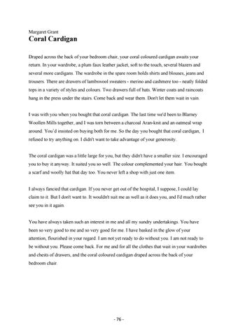 I was with you when you bought that coral cardigan. The last time we'd been to Blarney Woollen Mills together, and I was torn between a charcoal Aran-knit and an oatmeal wrap around. You’d insisted on buying both for me. So the day you bought that coral cardigan, I refused to try anything on. I didn't want to take advantage of your generosity.