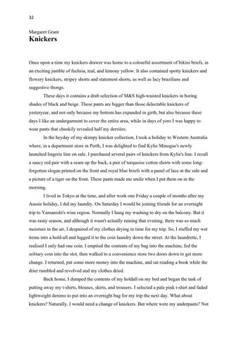 Knickers Once upon a time my knickers drawer was home to a colourful assortment of bikini briefs, in an exciting jumble of fuchsia, teal, and lemony yellow. It also contained spotty knickers and flowery knickers, stripey shorts and statement shorts, as well as lacy brazilians and suggestive thongs. These days it contains a drab selection of M&S high-waisted knickers in boring shades of black and beige. These pants are bigger than those delectable knickers of yesteryear, and not only because my bottom has expanded in girth, but also because these days I like an undergarment to cover the entire area, while in days of yore I was happy to wear pants that cheekily revealed half my derrière. In the heyday of my skimpy knicker collection, I took a holiday to Western Australia where, in a department store in Perth, I was delighted to find Kylie Minogue's newly launched lingerie line on sale. I purchased several pairs of knickers from Kylie's line. I recall a saucy red pair with a seam up the back, a pair of turquoise cotton shorts with some longforgotten slogan printed on the front and royal blue briefs with a panel of lace at the side and a picture of a tiger on the front. These pants made me smile when I put them on in the morning. I lived in Tokyo at the time, and after work one Friday a couple of months after my Aussie holiday, I did my laundry. On Saturday I would be joining friends for an overnight trip to Yamanishi's wine region. Normally I hung my washing to dry on the balcony. But it was rainy season, and although it wasn't actually raining that evening, there was so much moisture in the air, I despaired of my clothes drying in time for my trip. So, I stuffed my wet items into a hold-all and lugged it to the coin laundry down the street. At the laundrette, I realised I only had one coin. I emptied the contents of my bag into the machine, fed the solitary coin into the slot, then walked to a convenience store two doors down to get more change. I returned, put some more money into the machine, and sat reading a book while the drier rumbled and revolved and my clothes dried. Back home, I dumped the contents of my holdall on my bed and began the task of putting away my t-shirts, blouses, skirts, and trousers. I selected a pale pink t-shirt and faded lightweight denims to put into an overnight bag for my trip the next day. What about knickers? Naturally, I would need a change of knickers. But where were my underpants? Not
