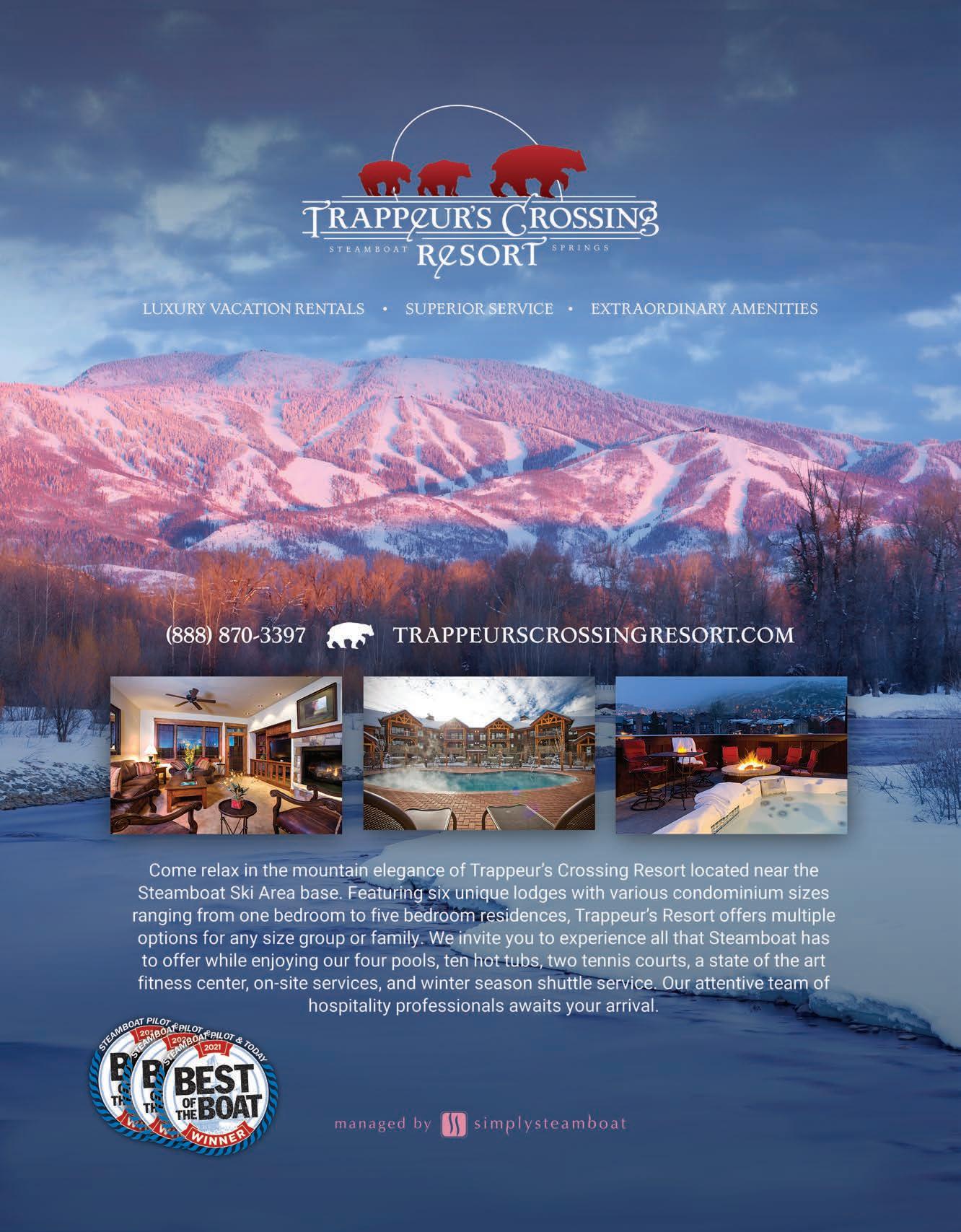 The Ski Season 2022-23 edition of the Steamboat Springs Visitors’ Guide is published by Ski Town Media, Inc., in conjunction with the Steamboat Springs Chamber.