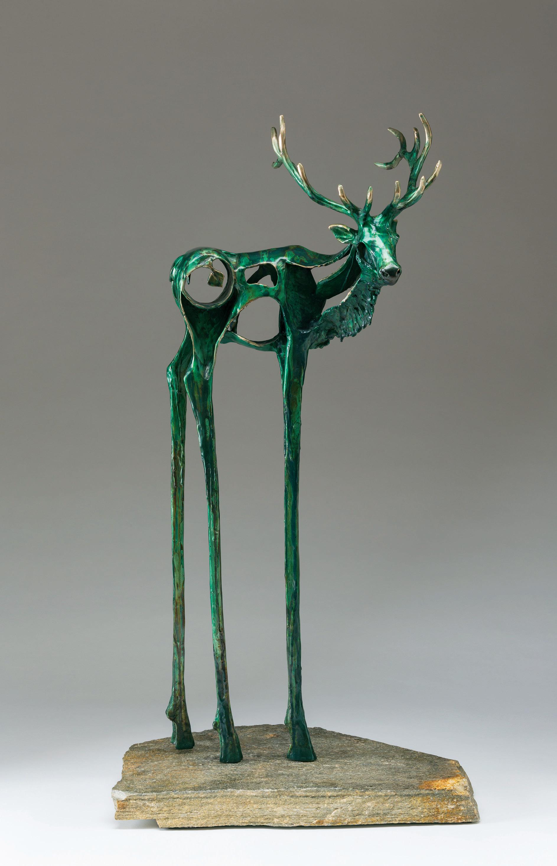 Having grown up on a farm in Scottsbluff, Nebraska, Graves sometimes depicts horses like the ones she rode as a child. Early in her career, she sculpted them realistically but soon decided they were dead in energy, so she began stretching their legs until they became infused with movement and emotion. “If Dali can do it, so can I,” she recalls thinking.
