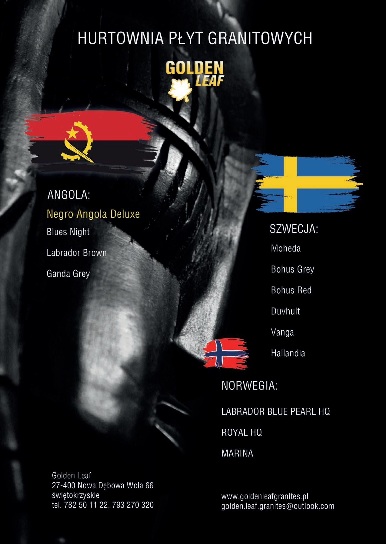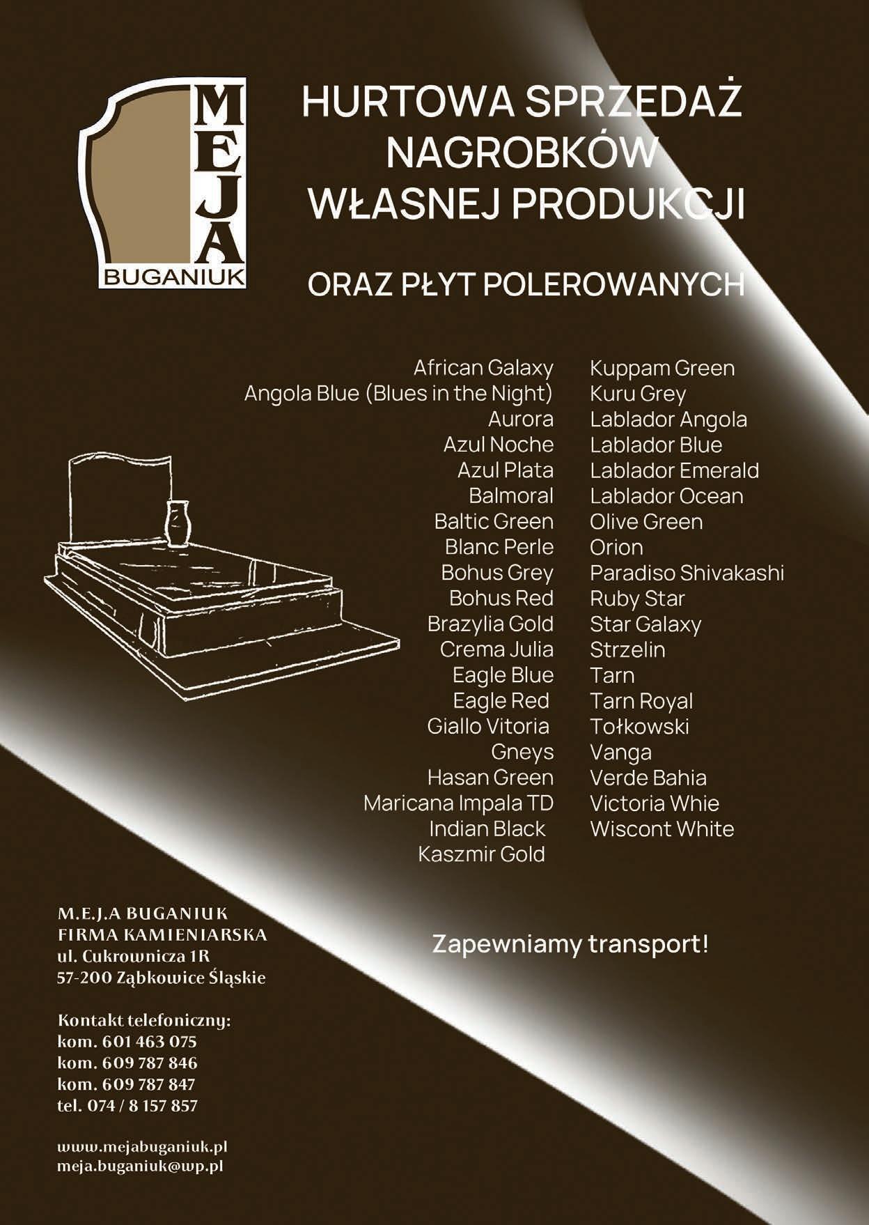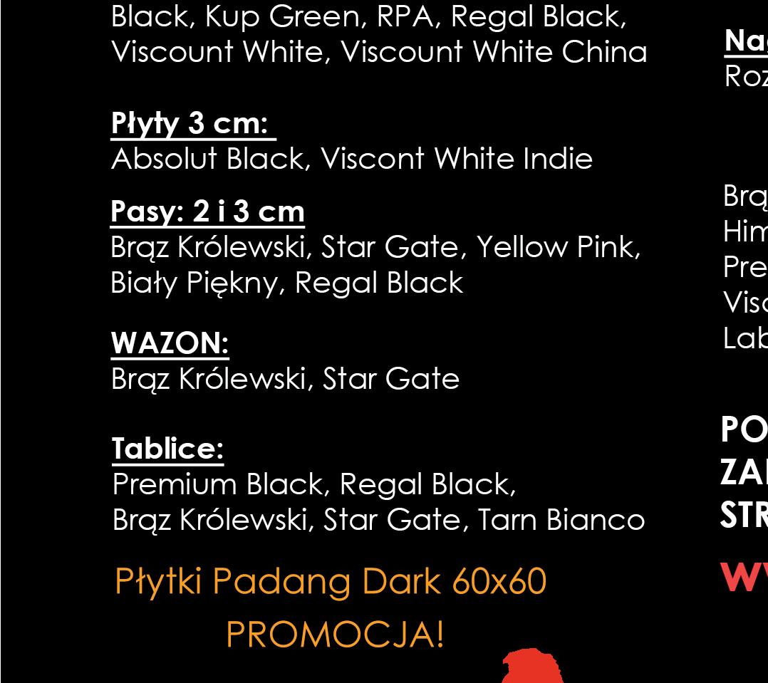 WŁASNA PRODUKCJA NOWOCZESNY PARK MASZYNOWY PŁYTY NIEŻYWICOWANE POLER NAJWYŻSZEJ JAKOŚCI ZNACZY JAKOŚĆ OFERUJEMY: AZUL NOCHE • BALMORAL • BALTIC GREEN • BELFAST BLACK NEW • BENGAL BLACK • BLUE IN THE NIGHT • BOHUS CZERWONY • BOHUS SZARY • CLOUDY • CREMA JULIA • GATO • GIALLO VICTORIA • GNEJS • HISZPAN SZARY • IMPALA BONACORD • IMPALA EAGLE BLUE • IMPALA KGS • IMPALA MARICANA • JASMINE WHITE • KASHMIR GOLD • KULLA • KUPPAM GREEN (VERDE MARINA) • KURU GREY • LABRADOR ANTIQUE • LABRADOR BLUE PEARL • LABRADOR EMERALD • LABRADOR OCEAN• NERO ANGOLA • OLIVE GREEN • ORION • ROSO PORINO • RUBY STAR • SHIVAKASHI (IVORY BROWN) • STRZEGOM • SZAMPANIA • SZWED CZARNY • SZWED ZIELONY • TOŁKOWSKI • VANGA • VERDE GLORIA • VERDE BAHIA • VISCOUNT WHITE • ZIMBABWE BLACK 56-500 SYCÓW, ul. Szosa Kępińska 77A; sycow@kamskal.pl; 661 444 946 58-210 ŁAGIEWNIKI, ul. Kłodzka 14; info@kamskal.pl; 74 89 39 774 LISTOPAD PEŁEN PROMOCJI!