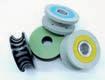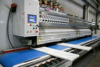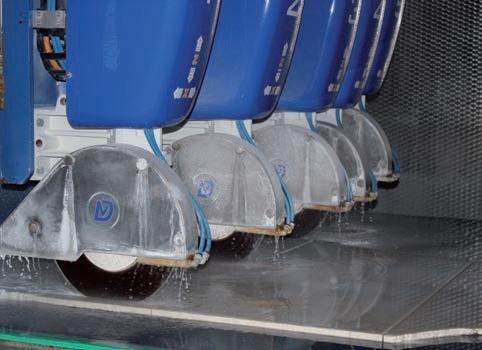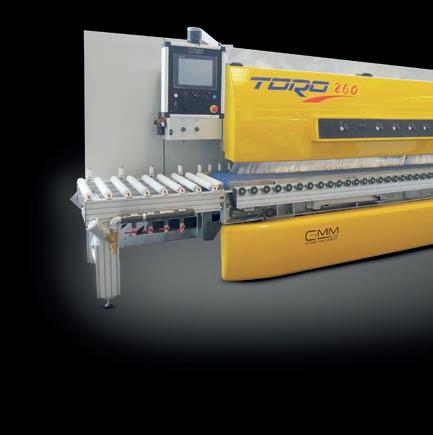 Jak dokładnie działa ta funkcja? Na wejściu do maszyny, przed wszystkimi wrzecionami, znajduje się rząd ruchomych rolek, których położenie względem osi „0” jest regulowane za pomocą reduktora z dokładnością do setnych części milime tra. Zespół ten, obsługiwany przez proste pokrętło ręczne, może cofnąć się do 6 mm względem pozycji „0” wrzecion polerujących. Po uruchomieniu detalu specjalna ściernica diamentowa, zamontowana na pierwszej głowicy w maszy nach do obróbki krawędzi prostych lub na dodatkowej gło wicy w maszynach do obróbki krawędzi typu bullnose, obra bia detal szlifując go idealnie i dokładnie według odchylenia ustawionego za pomocą ruchomej grupy rolek.