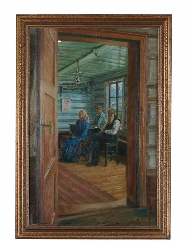 Ivar Lund sitt debutmåleri på Haustutstillinga i 1899. Personane er foreldra Embjørg og Ole og broren Titus, dei sit i daglegstugu på Austin i Nordberg. Foto: Martin Rustad Johansen. I privat eige.