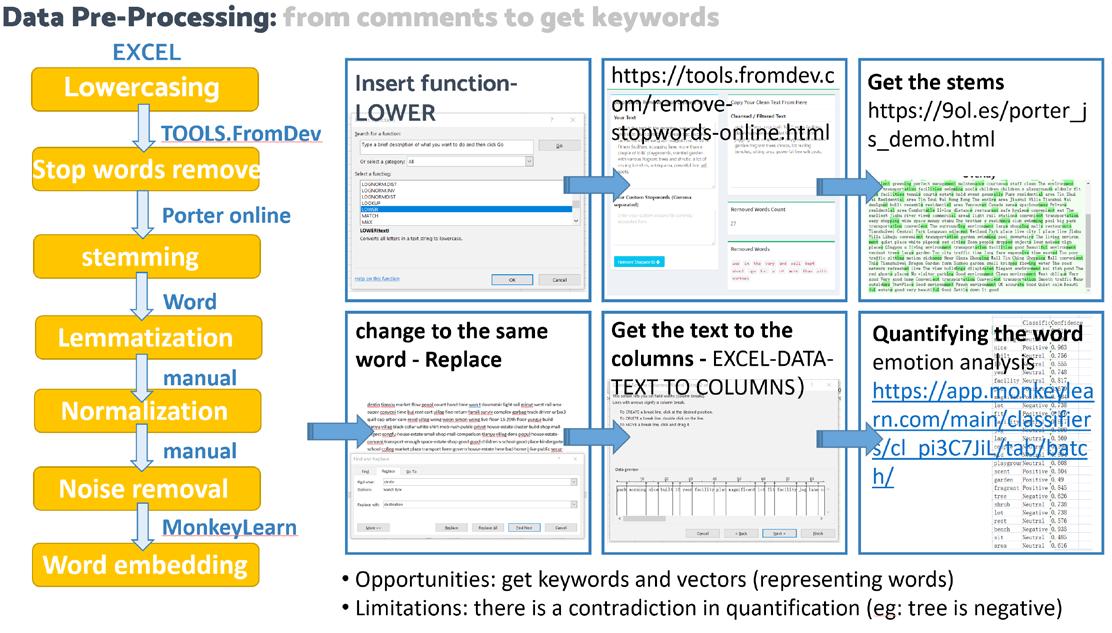 • Before starting the research, pre-processing of text should be carefully considered as well, for instance with text normalization, getting rid of stop words, or repetitive words, etc. – the system might clean the text in a way that important words get omitted which would otherwise influence the analysis result (e.g., sentiment of aspect-qualifier categorization).