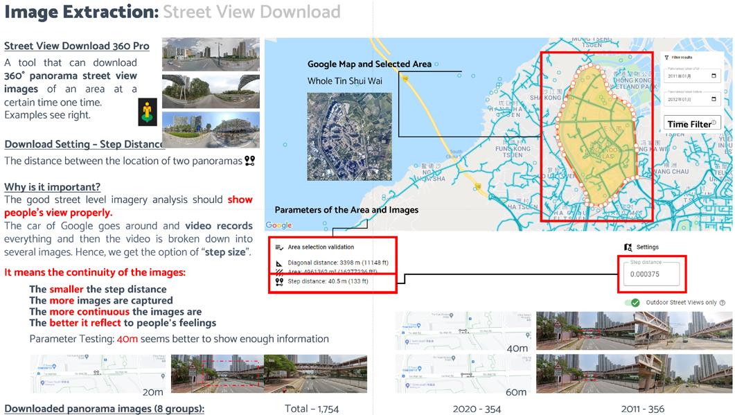 The group chooses to use Street View Download 360 Pro, an app for downloading 360° panoramas (example see Figure 4 2) from Google Street View, to extract the necessary images. With the area download tool it is easy to get all panoramas within an area during a certain period at one time. Moreover, the exif metadata are added to the image such as geolocation, elevation, date taken, camera rotation, etc. This may facilitate some future analysis.