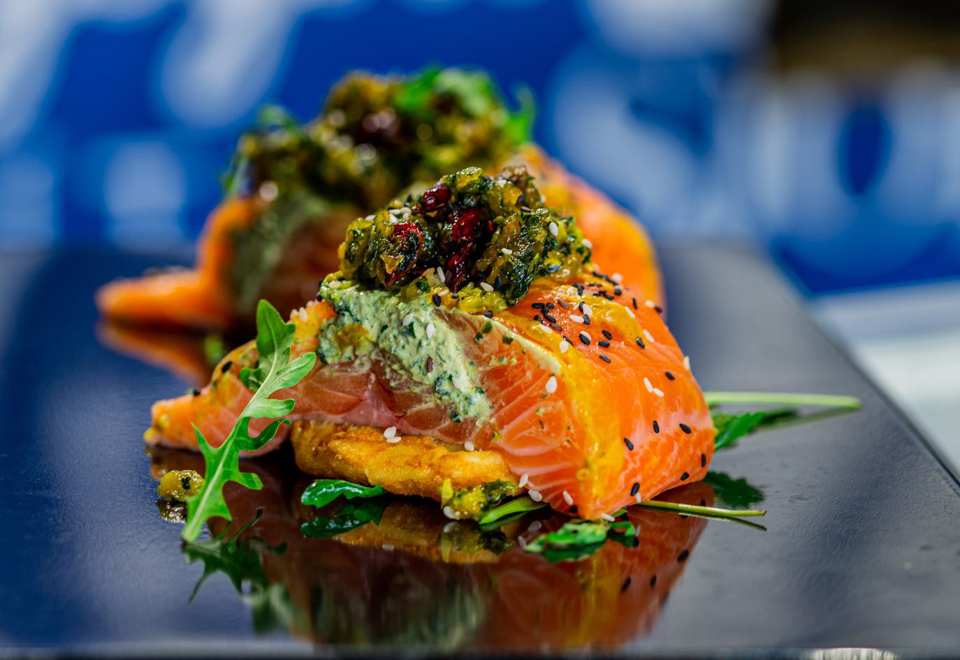Hrærið síðan saman í skál steinselju, sítrónusafa, kapers, hunangi, sinnepi, kryddblöndu, salti, pipar og olíu.