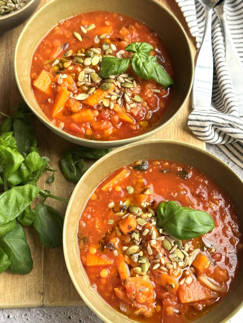 Lei beiningar: Hiti ÛlÌfuolÌu Ì potti og steiki lauk og hvÌtlauk Ì um 2 mÌn˙tur e a ˛ar til laukurinn er or in glÊr. BÊti vi gulrÛtumogsÊtrikartˆflu,steiki Ì a rar 2ñ3 mÌn˙tur. Helli tÛmˆtum, grÊnmetisso i, kollageni ˙t Ì, ·samt linsubaununum ( ef ˛Êr eru Ûso nar).