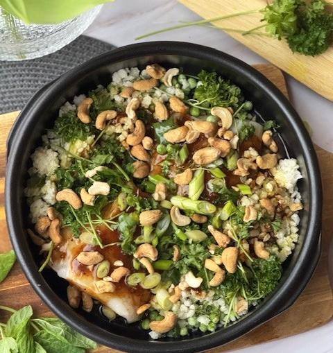 ,,hrÌsgrjÛnunumî Ì mÛti . Skeri lˆnguna Ì hÊfilega bita, setji ofan · baunir og blÛmk·l,salti ogpipri . Helli marineringunni yfir allt saman. Dreifi vel ˙r vorlauknum, steinseljunni og kasj˙hnetunum. Helli sm·afÛlÌfuolÌuyfir alltsaman. Setji inn Ì ofn Ì um 20-25 mÌn˙tur, fer eftir˛ykktinni·fiskinum. fiessid·samlegifiskrÈtturhittibeintÌmark og allir hÊst ·nÊg ir me hann. Mjˆg skemmtilegur og brag gÛ ur fiskrÈttur sem kemurskemmtilega·Ûvart. M·notahva a hvÌtafisksemer.Fr·bÊrta beraframme blˆndu u fersku salti, hrÌsgrjÛnum og prÛteinrÌkrihvÌtlaukssÛsu PrÛteinrÌkhvitlaukssÛsa: 250gr.laktÛsafrÌgrÌskjÛg˙rtfr·Arna. 2hvÌtlauksrif,pressu . Sm·afferskristeinselju,sm·ttsˆxu . 1/2avÛkadÛ,stappa . 1tsk.cummin. 1tsk.hunang. Sm·salt. KristjanaSteingrÌmsdÛttir(Jana) jana.is-www.instagram.com/janast - Gæðin skipta máli -