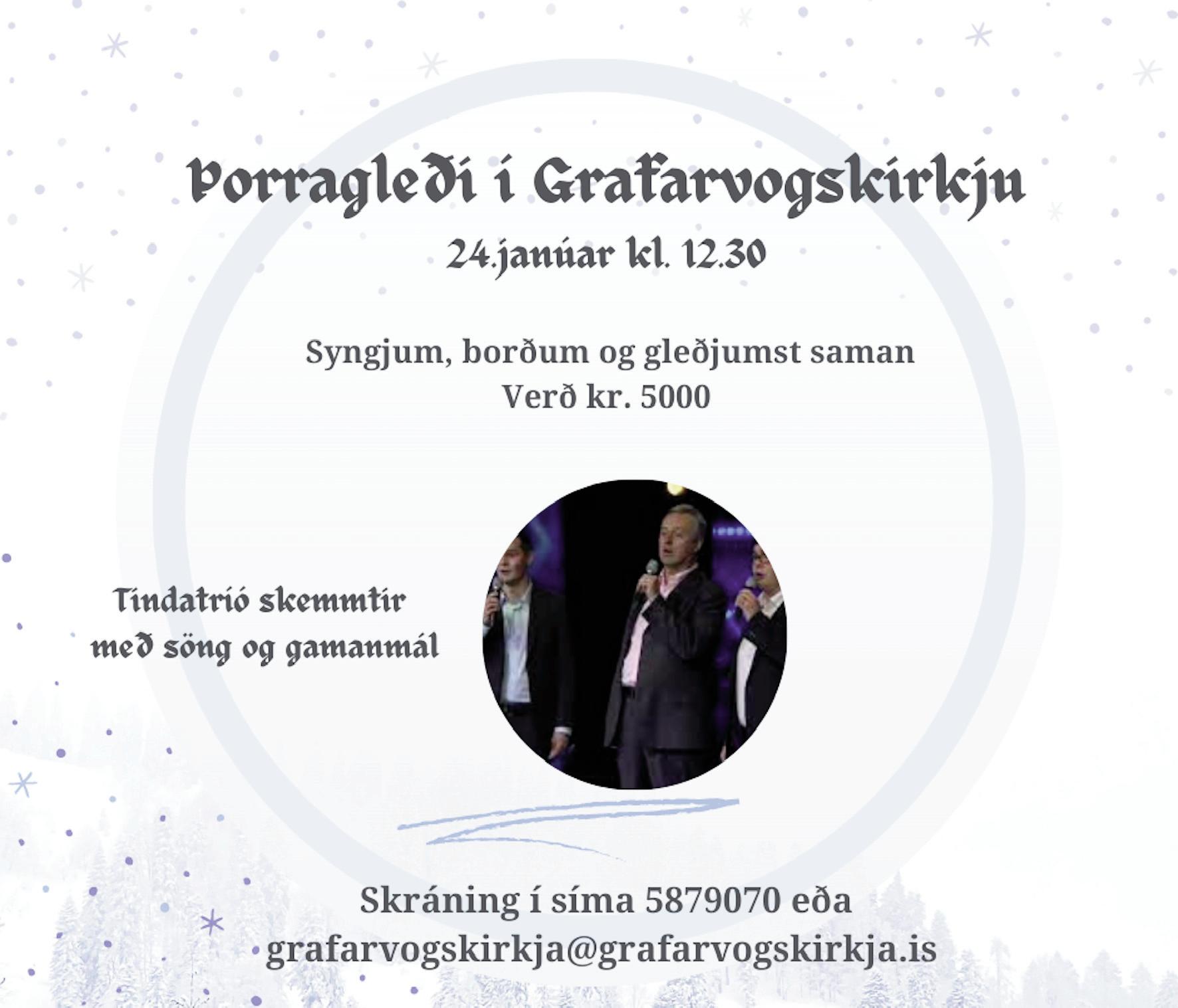 Borðhald, söngur og gleði. Tindatríóið verður með söng og gamanmál. Verð er kr. 5000 og skráning er í kirkjunni í síma 5879070 eða grafarvogskirkja@grafarvogskirkja.is