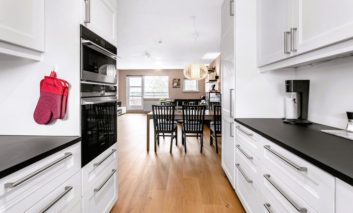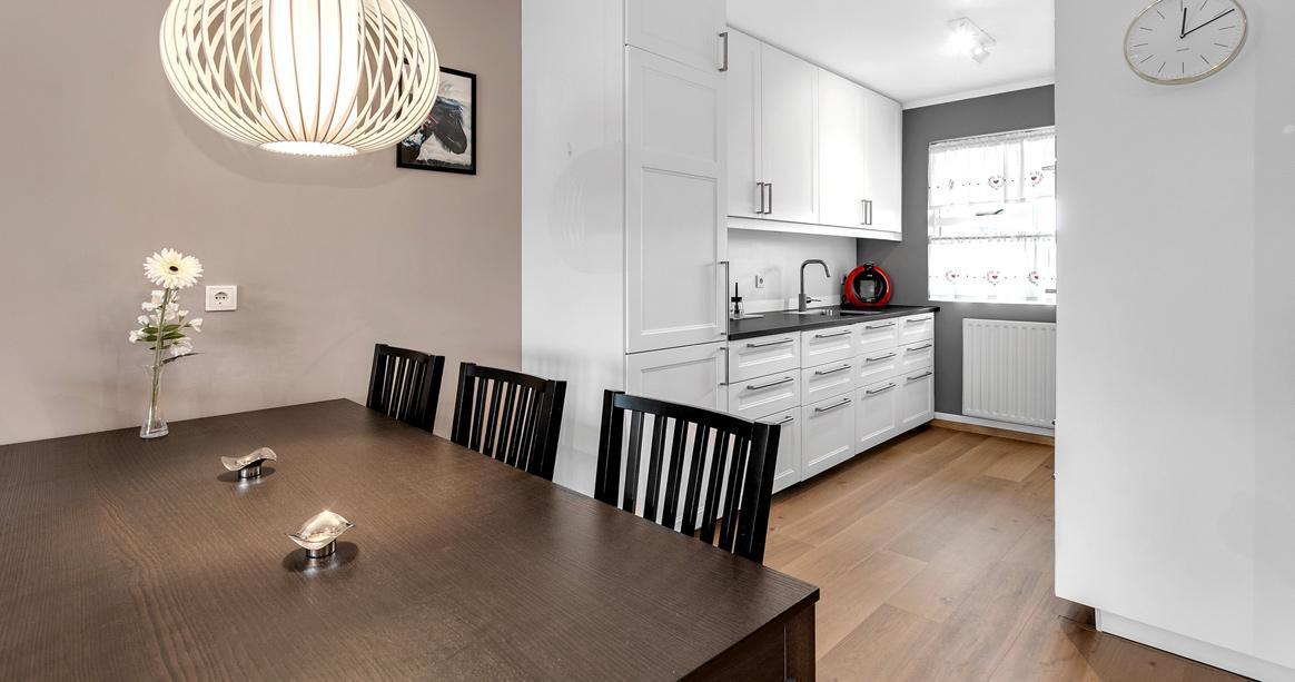 Eldhús er með nýlegri hvítri innréttingu með dökkum borðplötum og harðparket á gólfi.