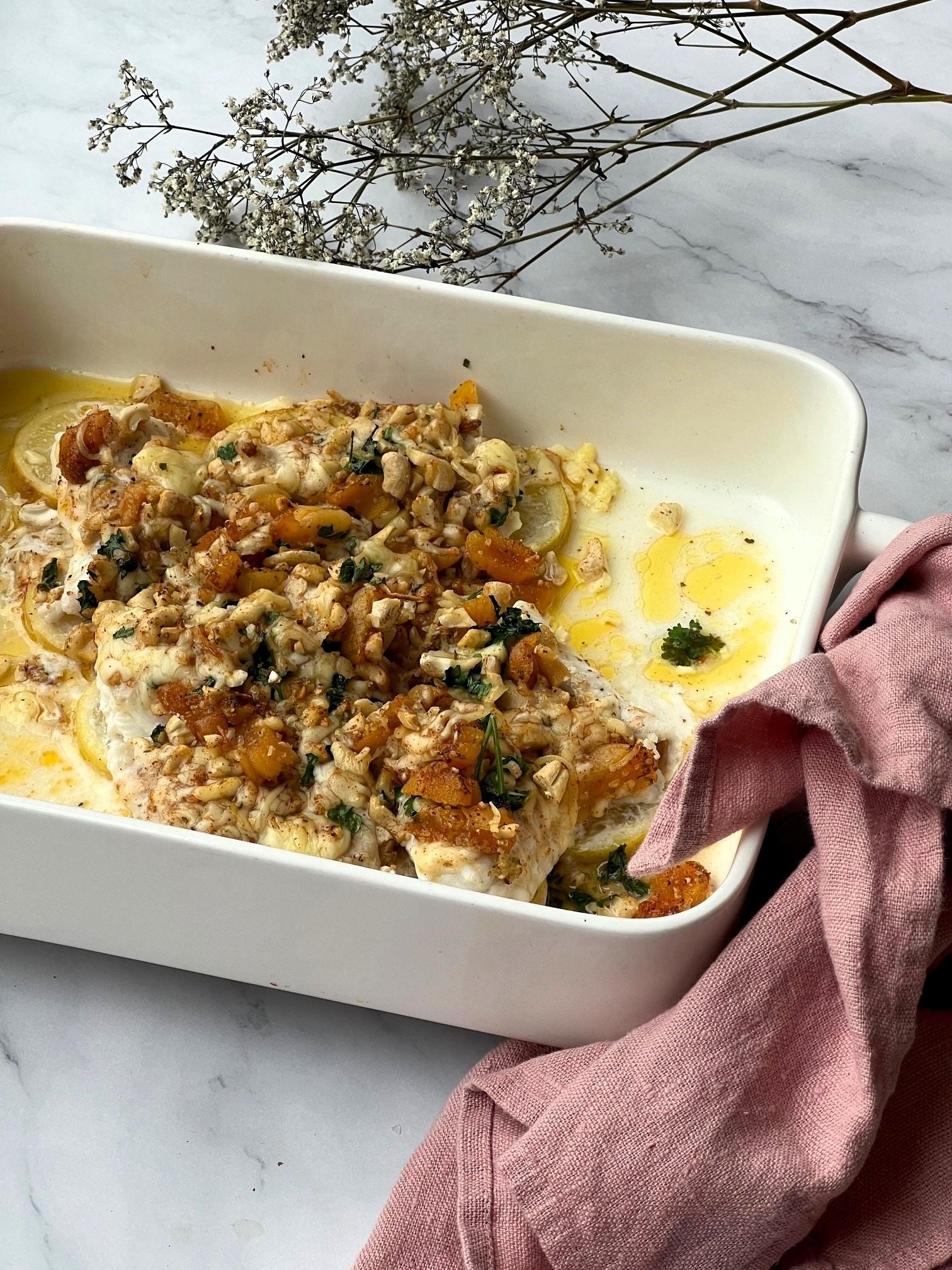 Steinbítur með kasjúhnetum, hvítlauk, apríkósum og brædddum osti.