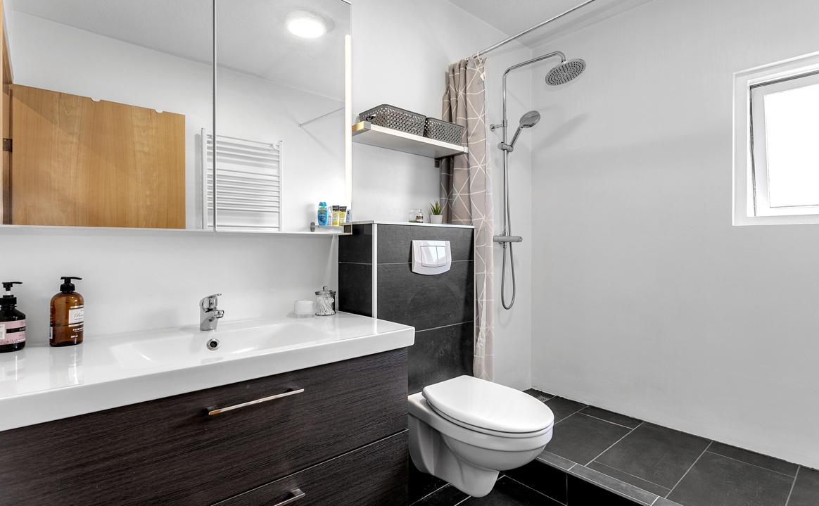 Baðherbergi er með góðri innréttingu, upphengdu salerni og sturtu, gólf er flísalagt, opnanlegur gluggi er á baðherbergi.