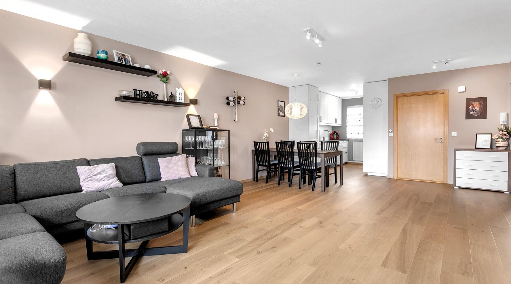 Stofa/borðstofa er björt og rúmgóð með harðparketi á gólfi.
