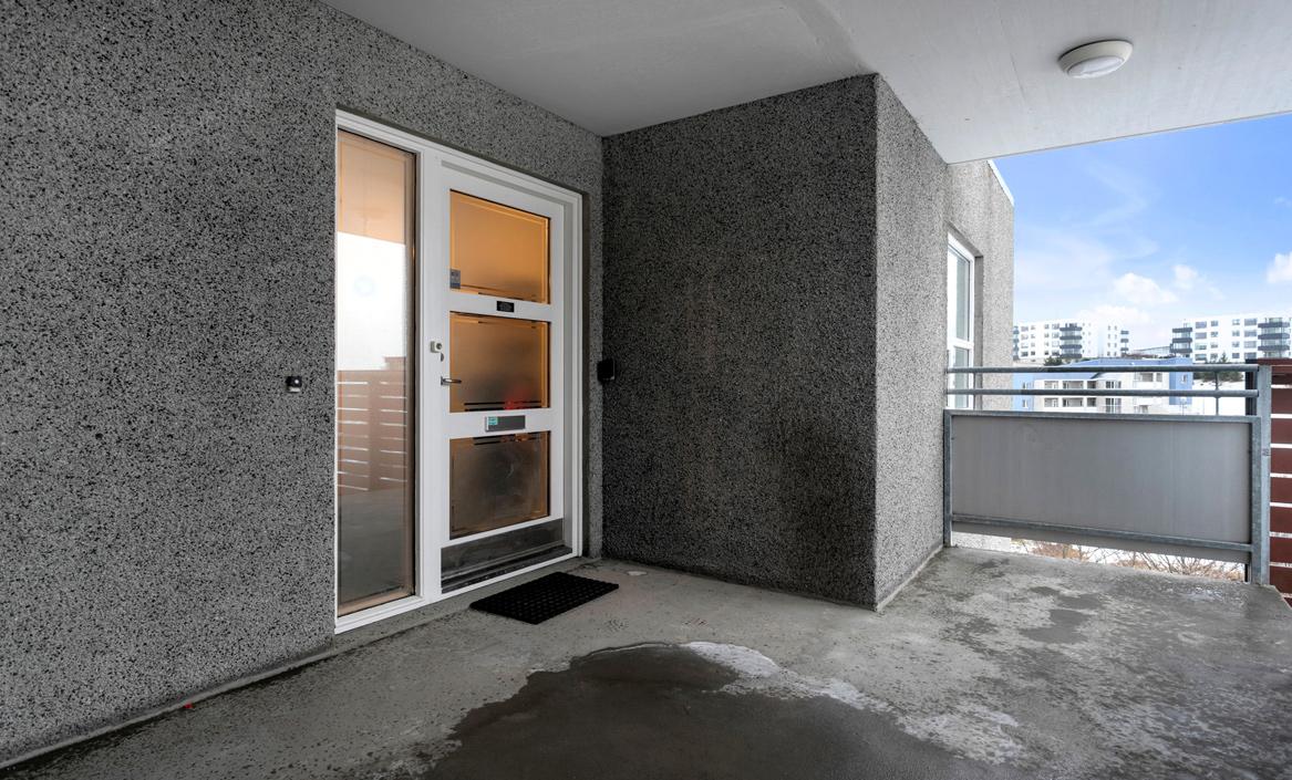 Eignin skiptist í forstofu, eldhús, stofu, borðstofu, þrjú svefnherbergi, baðherbergi, þvottahús og geymslu. Á jarðhæð er sameiginleg hjólageymsla. Íbúðin er vel skipulögð og gengið er inn í íbúðina af opnum svalagangi. Mikið útsýni er úr íbúðinni. Gluggar eru á fjóra vegu.