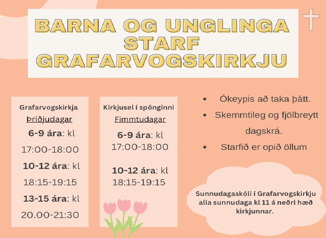 6-9 ára starf er á þriðjudögum kl. 17:00 - 18:00 í Grafarvogskirkju. 10-12 ára starf er á þriðjudögum kl. 18:15 - 19:15 í Grafarvogskirkju.