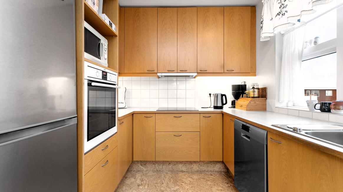 Eldhús er rúmgott með góðum viðarinnréttingum og borðkrók korkur á gólfi.