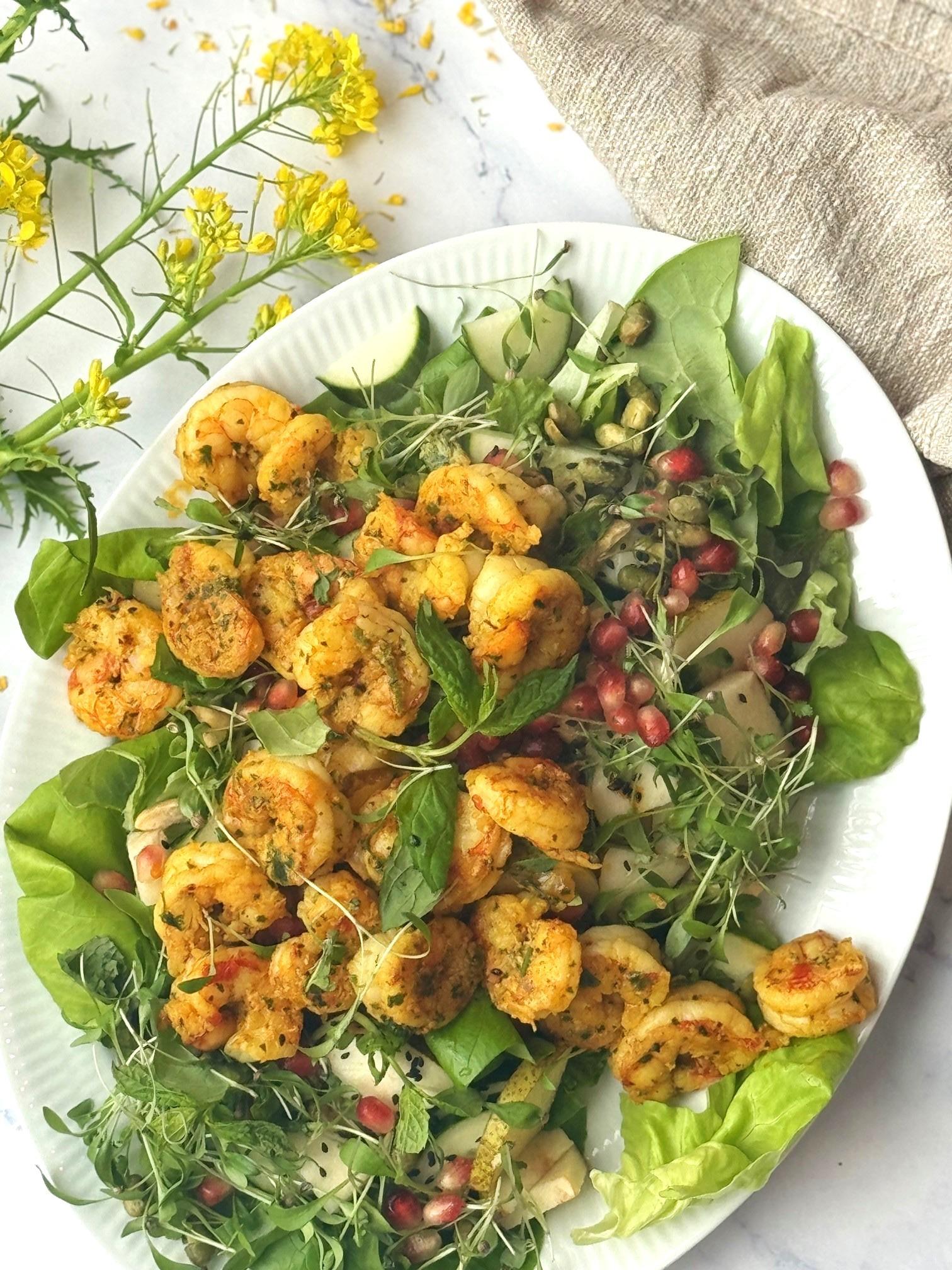 Hitið pönnu með 1 msk. af olíu og steikið rækjurnar í um 2-3 mínútur á hvorri hlið. Þú gætir þurft að gera þetta í tveim skömmtum, því það er ekki gott að hafa of mikið á pönnunni í einu. Kælið rækjurnar í smá tíma og setjið þær ofan á salatið og toppið með góðri sítrónuolíu, salti, pipar og sprettum/ spírum.