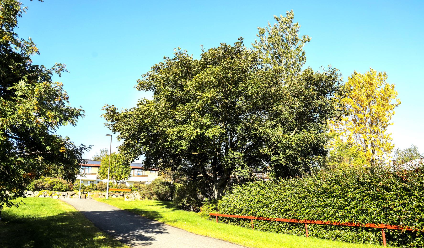 Garðahlynur við Reykjafold var útnefnt Hverfistré Grafarvogs í haust. Ekki eru nema 37 ár frá því að hlynurinn var gróðursettur, en hann hefur vaxið vel og dafnað á þeim tíma. Tréð sést vel frá göngustíg í hverfinu og gleður fólk sem á leið hjá. Skógræktarfélag Reykjavíkur stóð að útnefningunni sem ætlað er að vekja athygli á fallegum trjágróðri í borginni og hve verðmætur hann er. GV-Mynd Hjördís Jónsdóttir