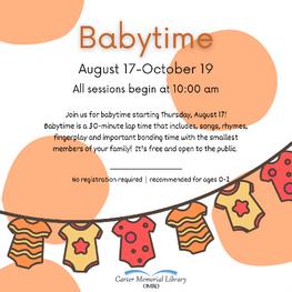 Babytime sessions meet on Thursdays at 10:00 am Babytime is a 30minute lap time that includes songs, rhymes, fingerplay and important bonding time with the smallest members of your family! It's free and open to the public. Babytime is recommended for ages 0-2.