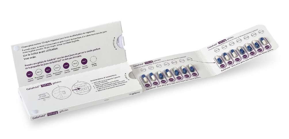 A používaný na liečbu Fabryho choroby u pacientov s variantom génu pre galaktozidázu alfa (GLA). Funguje tak, že stabilizuje dysfunkčný alfa-Gal A enzým, tak ž e mô ž e vy č isti ť nahromadenie glykos fi ngolipidového substrátu choroby.