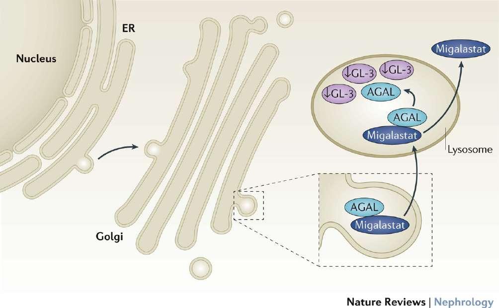 Je založený na jeho schopnosti pôsobiť ako farmakologický šaperón (proteín alebo malá molekula, ktorá asistuje pri správnom zlo ž ení in ý ch proteínov v bunkách). V tomto prípade funguje ako farmakologický šaperón pre mutované formy α -Gal A enz ý mu, ktoré sú prítomné u pacientov s Fabryho chorobou.