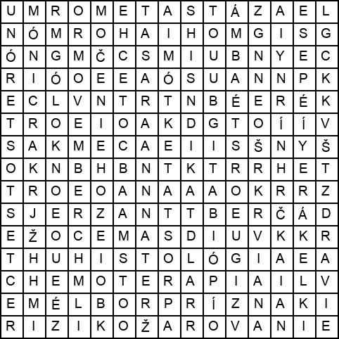 Použité slová: antigén, boj, bunka, chemoterapia, choroba, genetika, histológia, hmat, hormón, hrčka, karcinóm, krv, lekár, liek, metastáza, movember, močenie, mustache, muž, odborník, onkológ, otec, ožarovanie, problém, prostata, prostatektómia, príznak, rasa, riziko, samec, starší, syn, tabu, testosterón, vek, zanedbanie, zdravie