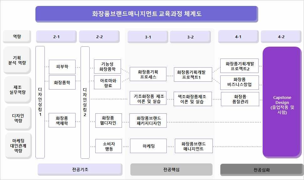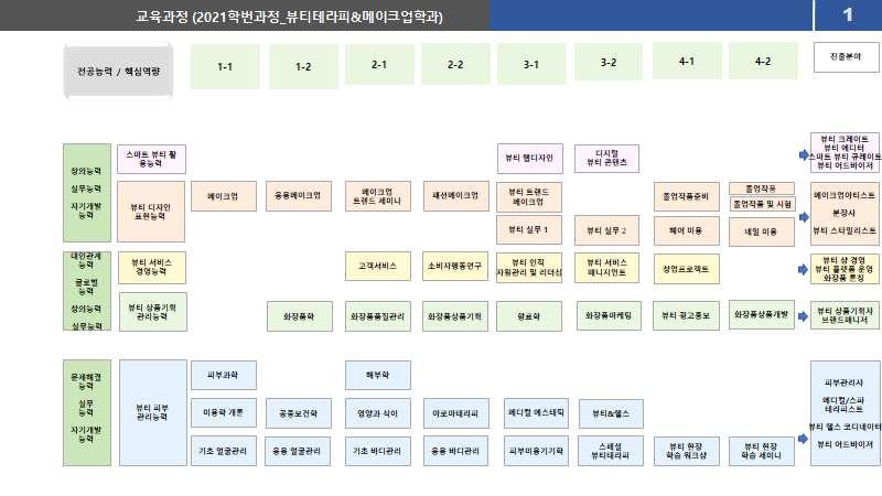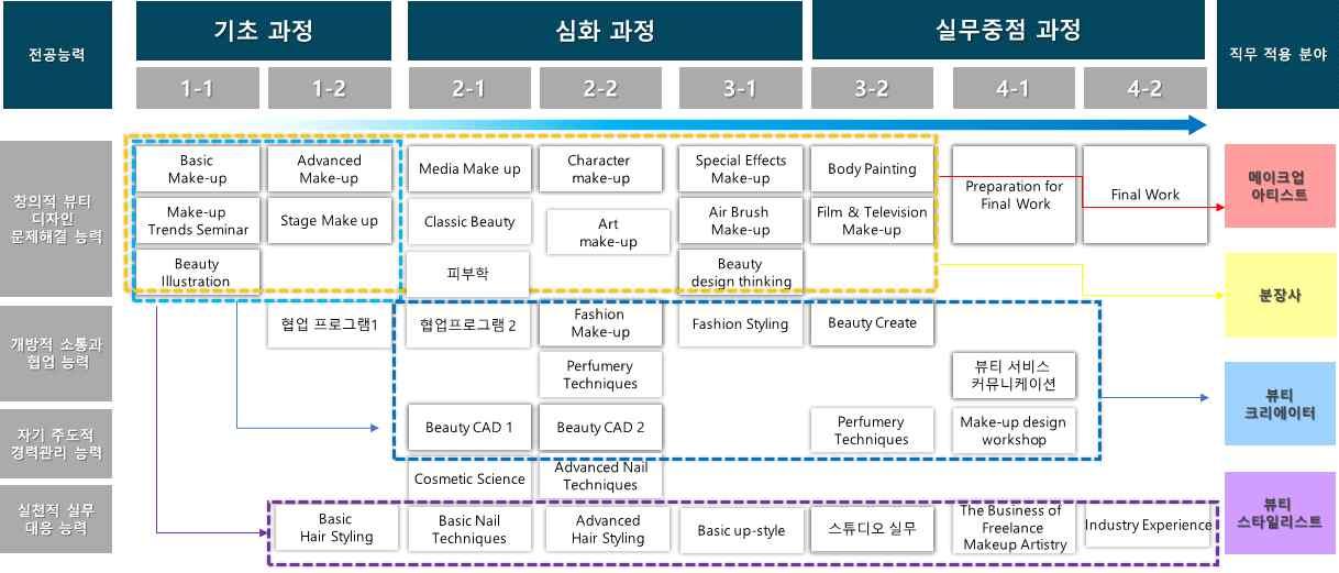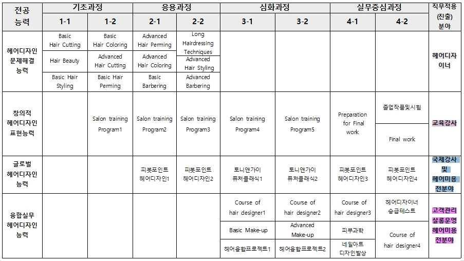 헤어디자인학과전공교육과정은기초전공,응용전공,전공심화,현장실무과정으로구성된 다.1학년은기초공통,기초전공교육과정으로운영되며전공역량을배양하기위해기본적인 이론과방법을학습하는과정이다 2,3학년은응용전공,전공심화교육과정으로운영되며 전공지식과시술테크닉을보다심도있게학습하는교육과정이다 4학년은현장실무교육과 정으로운영되며미용산업체에적용가능한실무능력을습득하기위한과정이다.이러한교 과과정을통해서미용분야의다학제적융ž복합능력을보유한경쟁력있는Designer를양성 할수있다
