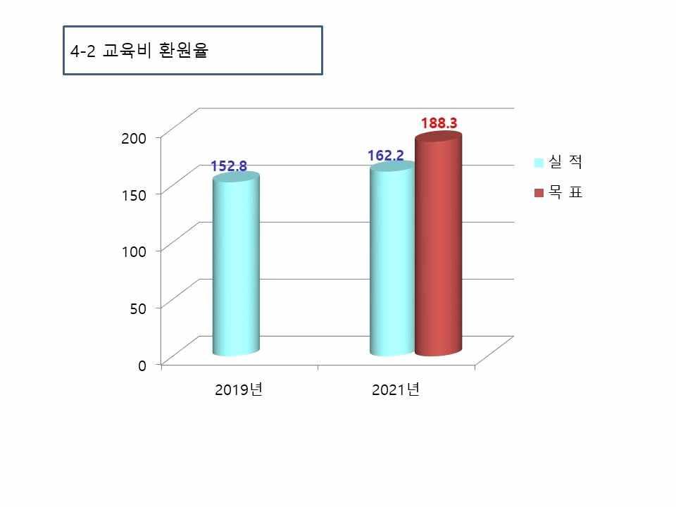 지표명 (4-2)교육비환원율 평가목적 교육에대한투자현황판단 지표특성 망대 산출공식 [등록금수입(원)/자금수입(원)] ◐목표수준 구 분 2019년현황 2021년현황 2019년목표 교육비환원율(%) 152.8 162.2 188.3 ◐현황 (단위:원) 년 도 등록금수입 총교육비 교육비환원율 2021 49,019,921,066 79,504,649,774 162.2 ※2020년회계결산기준 ◐평가결과 2021년목표 (A) 2021년실적 (B) 달성률(%) (B/A)×100 188.3 162.2 86.1 평가 의견