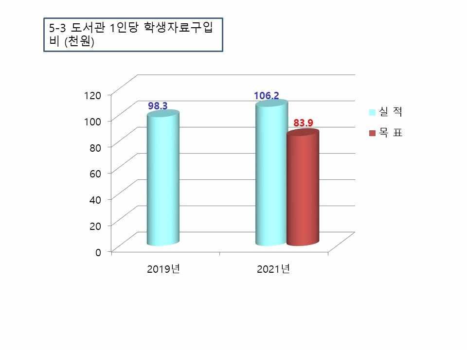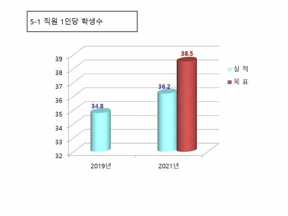 5-1 직원1인당학생수 38.5 5-2 기숙사수용률 23.4 5-3 도서관1인당학생자료구입비(단위:원) 83.9 6. 학생 성과