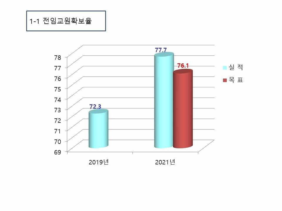-전임교원확보율은2019년72.3%에서2019년76.1%로증가하였으며 2021년목표대비달성률은102.1%임 -기본역량진단을대비하여산학협력중점교원및강의전담교원의대거 충원을통해,목표대비102.1%를초과달성하였음