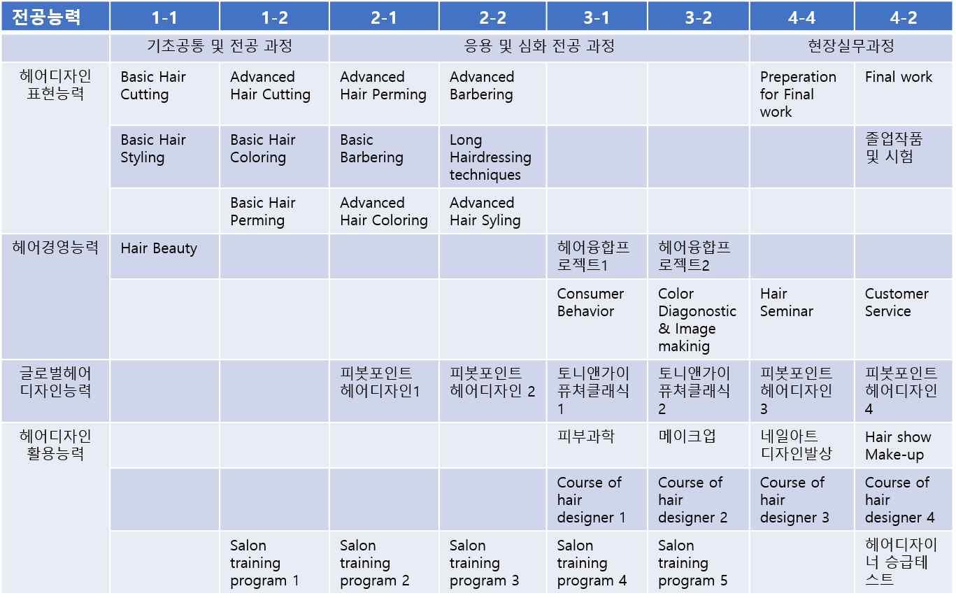 운영되며미용산업체에적용가능한실무능력을습득하기위한과정이다 이러한교과과정을 통해서미용분야의다학제적융ž복합능력을보유한경쟁력있는Designer를양성할수있다.