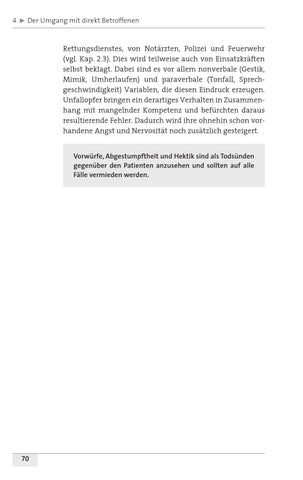 Rettungsdienstes, von Notärzten, Polizei und Feuerwehr (vgl. Kap. 2.3). Dies wird teilweise auch von Einsatzkräften selbst beklagt. Dabei sind es vor allem nonverbale (Gestik, Mimik, Umherlaufen) und paraverbale (Tonfall, Sprechgeschwindigkeit) Variablen, die diesen Eindruck erzeugen. Unfallopfer bringen ein derartiges Verhalten in Zusammenhang mit mangelnder Kompetenz und befürchten daraus resultierende Fehler. Dadurch wird ihre ohnehin schon vorhandene Angst und Nervosität noch zusätzlich gesteigert. Vorwürfe, Abgestumpftheit und Hektik sind als Todsünden gegenüber den Patienten anzusehen und sollten auf alle Fälle vermieden werden.