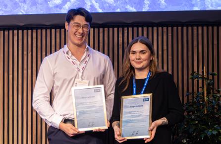 VIKTOR ÖLÉN FRÅN JURYN överräckte diplom till årets stolta vinnare, Anton Julin Wallén och Nellie Mikander. Stipendiet delas ut för bästa examensarbete inom kyl- och värmepumpsteknik på både yrkeshögskole- och högskolenivå, med syftet att uppmuntra kunskap som stärker kvalitet, säkerhet och hållbarhet i branschen.