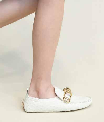 The iconic Gommino remains the symbol of Tod’s lifestyle, with the new “glove” model featuring a series of rings forming a distinctive pattern, alongside a version with richly handwoven leather detailing. Brushed leather mules and sandals with slim metal band detail complete the collection.