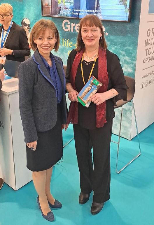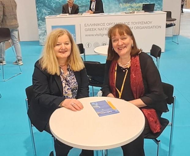 Oikealla kuvassa istumassa liiton sihteerin Minnan kanssa Kreikan valtion matkatoimiston toiminnanjohtaja Maria Zevgoula Tukholman toimistosta.