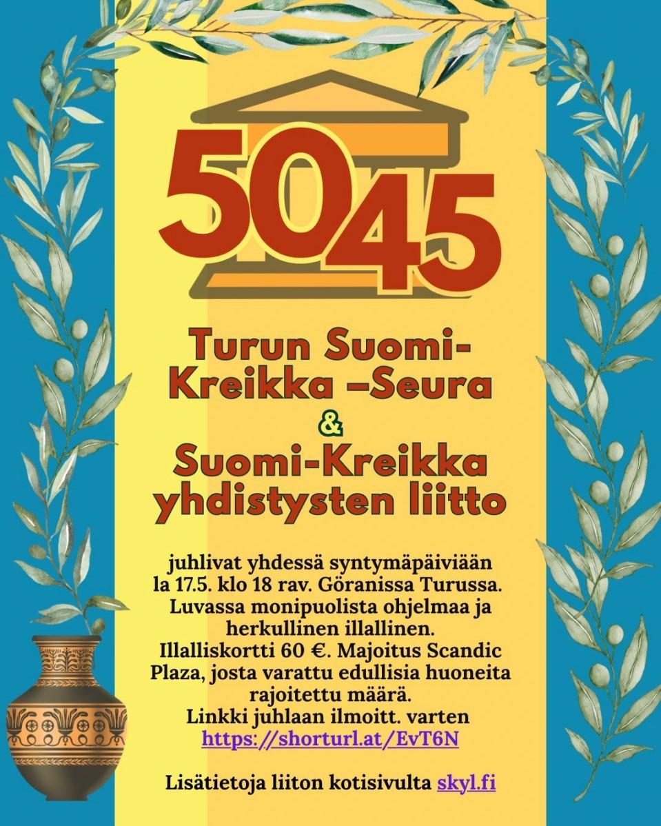 La 17.5. vietetään Seuramme 50-vuotisjuhlaa yhdessä 45-vuotiaan Suomi-Kreikka yhdistysten liiton kanssa Forum Marinumissa, ravintola Göran klo 18 alkaen. Illalliskortti 60 €.