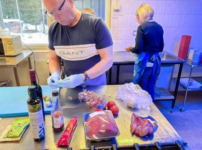 Turvalinkki ry:n tilava, hyvin varusteltu keittiö salli hyvin tämänkokoisen porukan kokkailun ja vielä tilavampi sali yhteisruokailun ja ruokatanssit. Allekirjoittanut kirmaili edellisen iltapäivän ruokakaupassa keräten kärryllisen ruokatarvikkeita kuin kreikkalainen suurperheellinen ja WhatsApp lauloi Turkkuseen päin tiheään. Eikun tuumasta toimeen ja essut päälle.