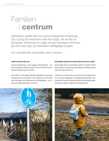 Familien i centrum Infrastruktur gælder ikke kun byens nærliggende omfartsveje. Og i Lystrup er infrastruktur ikke blot noget, der ser flot ud på papiret. Infrastruktur er noget, der gør hverdagen nemmere, gør livet mere trygt og forbindelser selvfølgelige og ligetil. For i børnefamilier skal familien være i centrum.