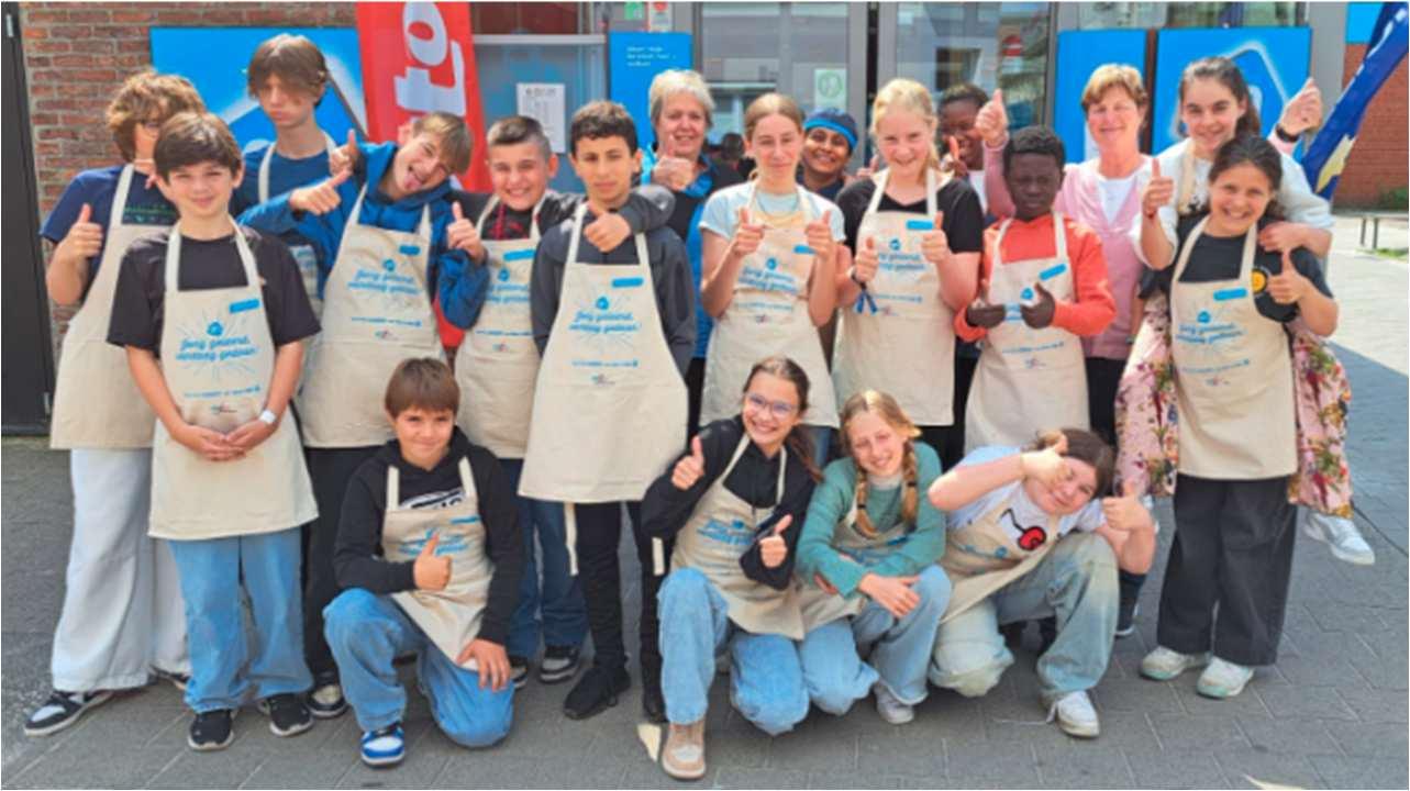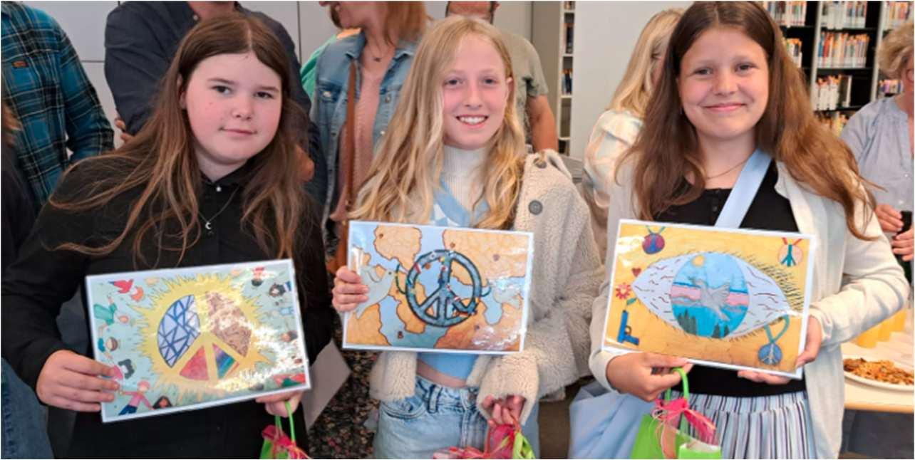 De laureaten van de Lions Club vredesposter werden in de bloemetjes gezet met een feestelijke receptie in de bib.