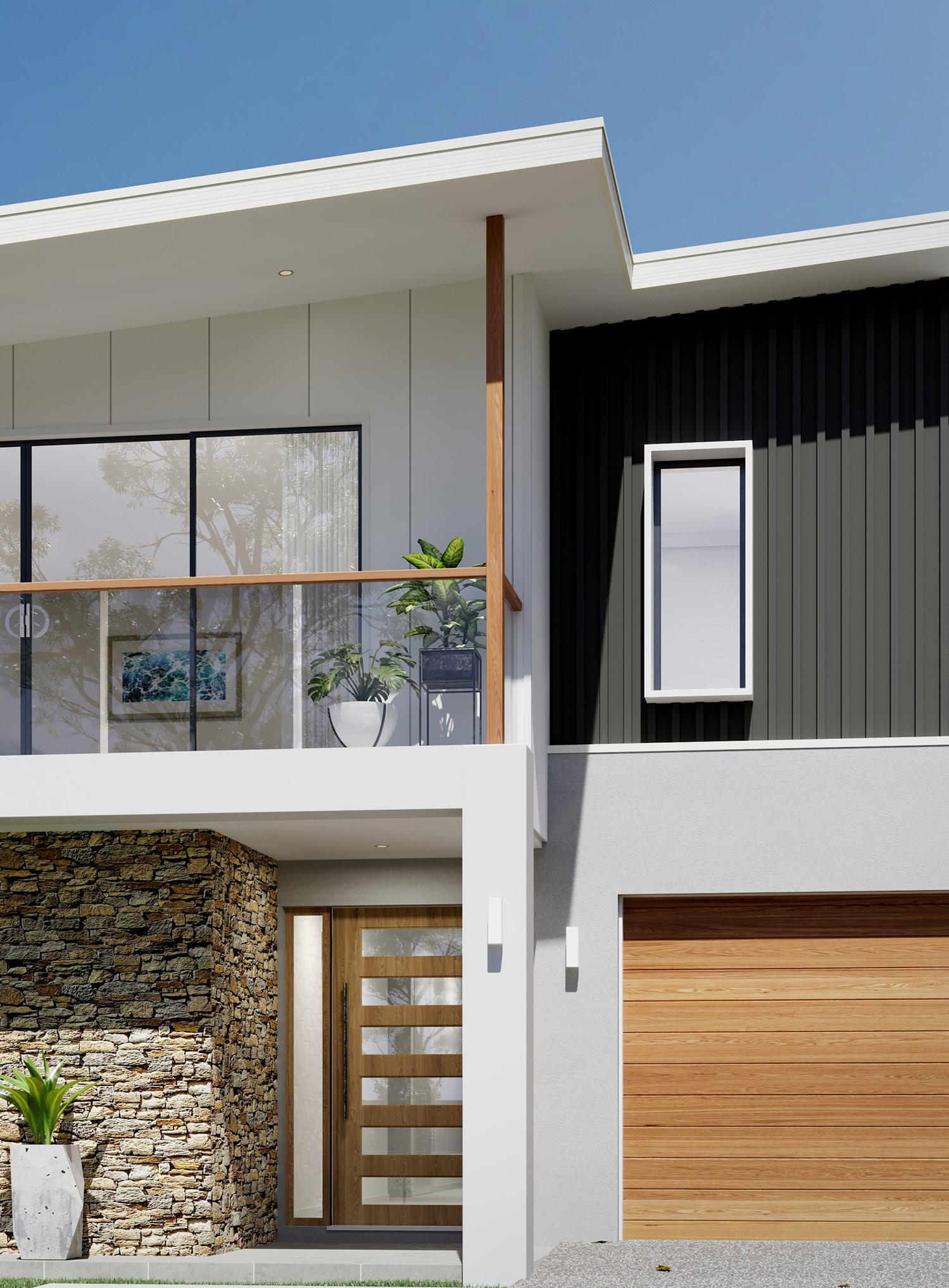 • timber, weatherboard, and other contemporary cladding, rendered brick and stone