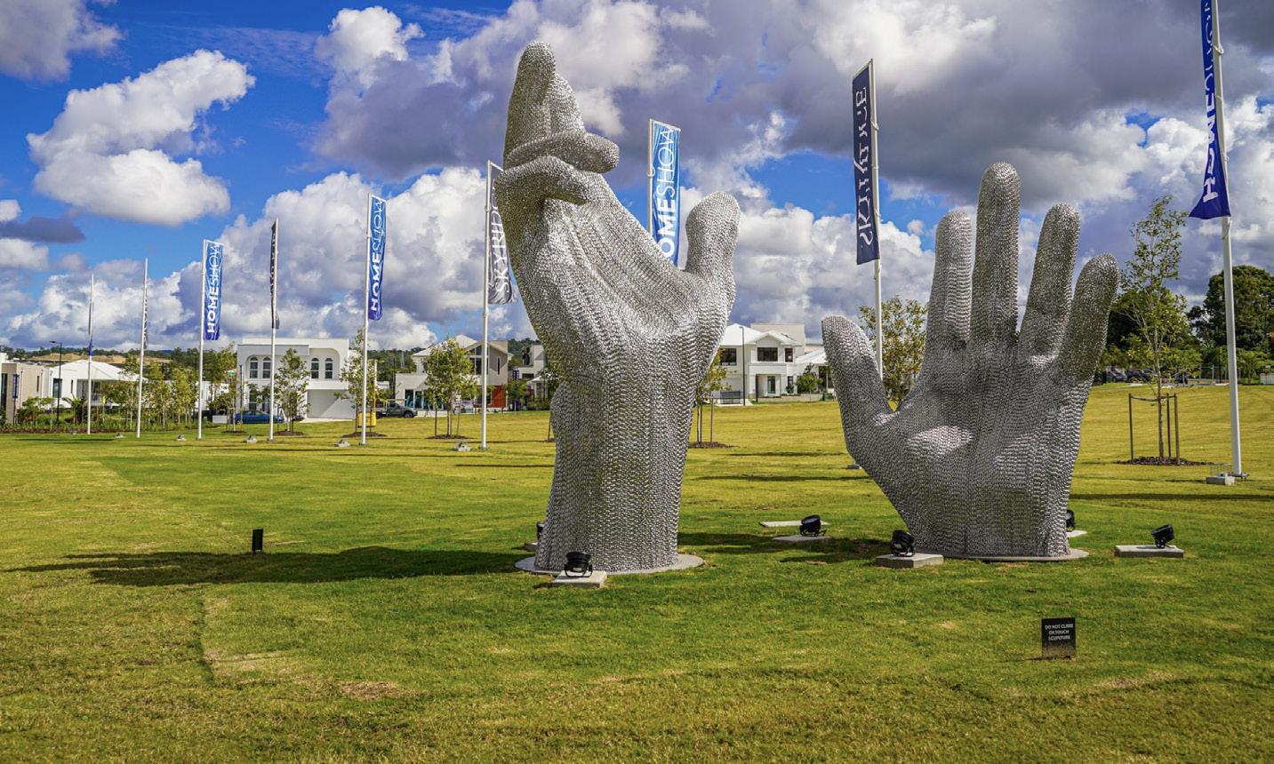 During the day, Welcoming Hands captures the sunlight creating a shimmering landmark that almost feels alive, while at night, dramatic lighting turns the piece into an open-hearted beacon to locals and visitors alike.