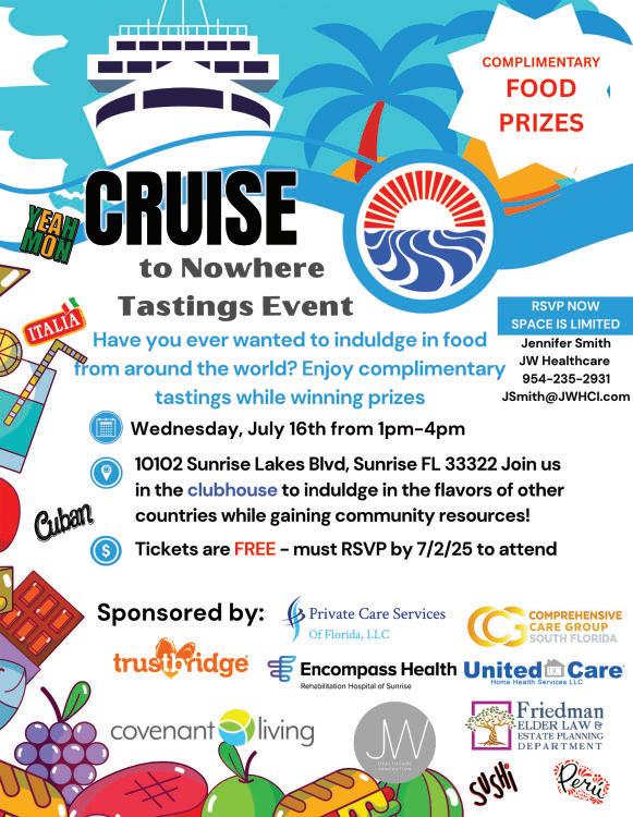 • El miércoles 16 de julio tendremos un evento que no se quieren perder. Esta patrocinado por JW Healthcare & Private Care. Incluye la oportunidad de probar platos de restaurantes locales. El cupo es limitado. Deben llamar y reservar sus lugares. Para más información, consulte el anuncio “Cruise To Nowhere” en esta revista.