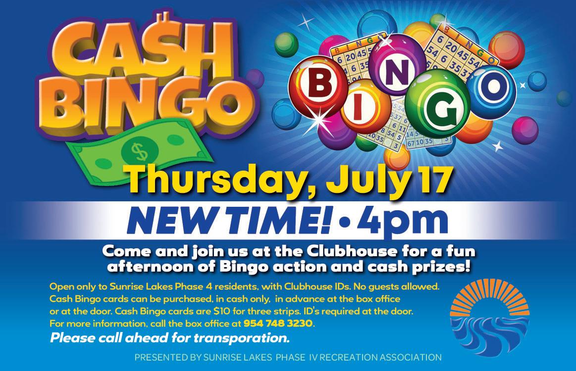 Cash Bingo: Thursday, July 17 | New Time! 4pm • Same great game, brand new time! Come try your luck and enjoy an afternoon of excitement and prizes.