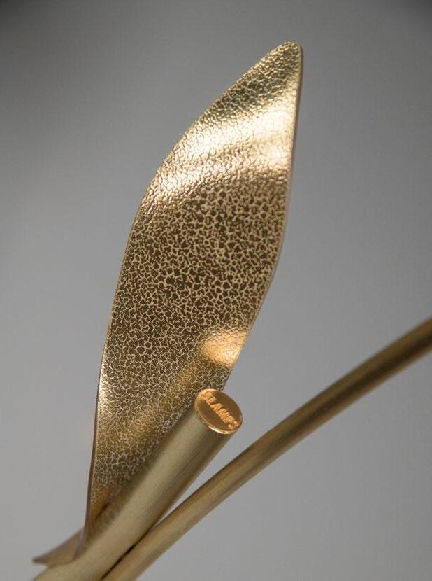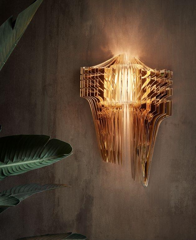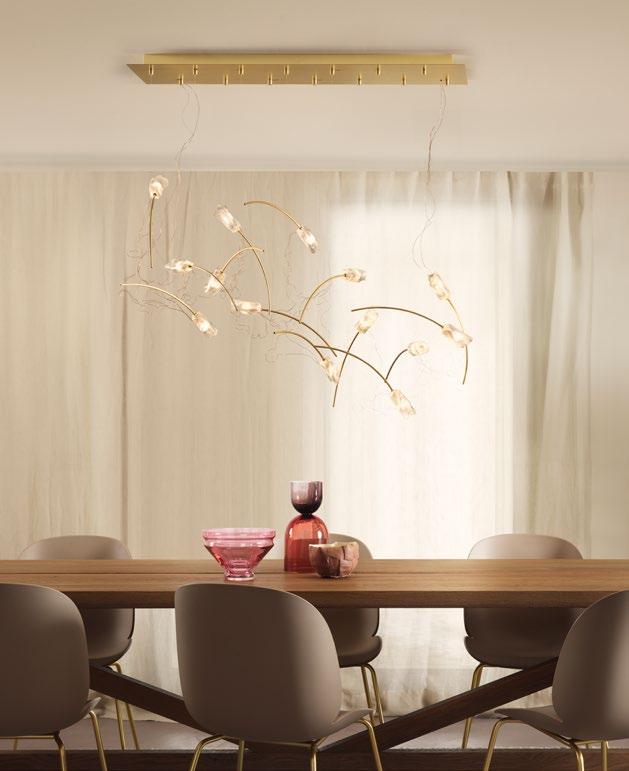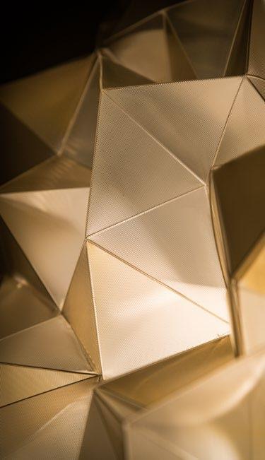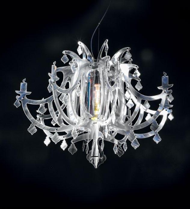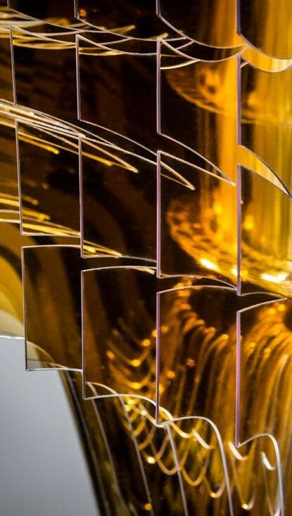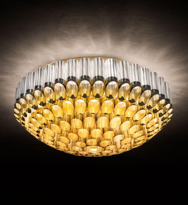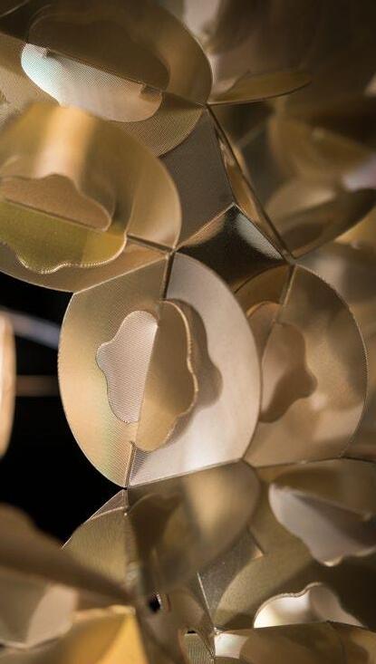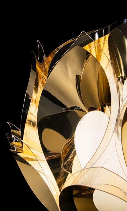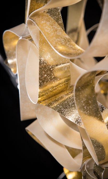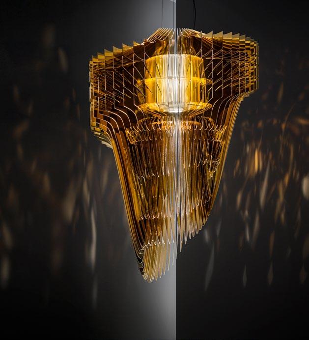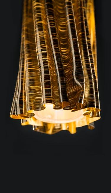 Aria Gold has Cristalflex® arms metallized in a hyperbaric chamber; each piece is cut numerically, wrapped, and placed within the shipping box. Clients can rapidly and intuitively assemble the lamp.