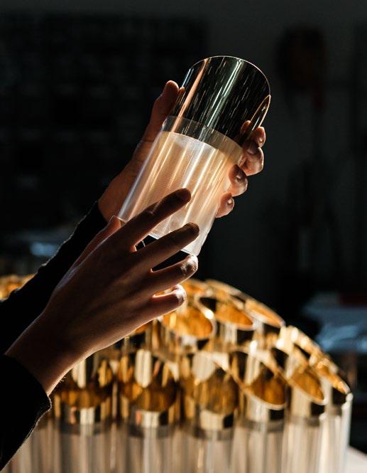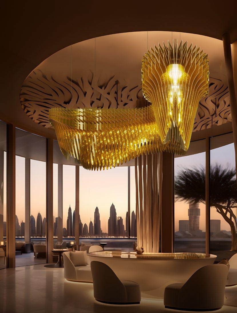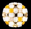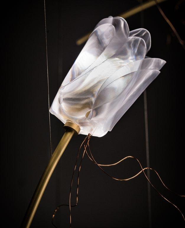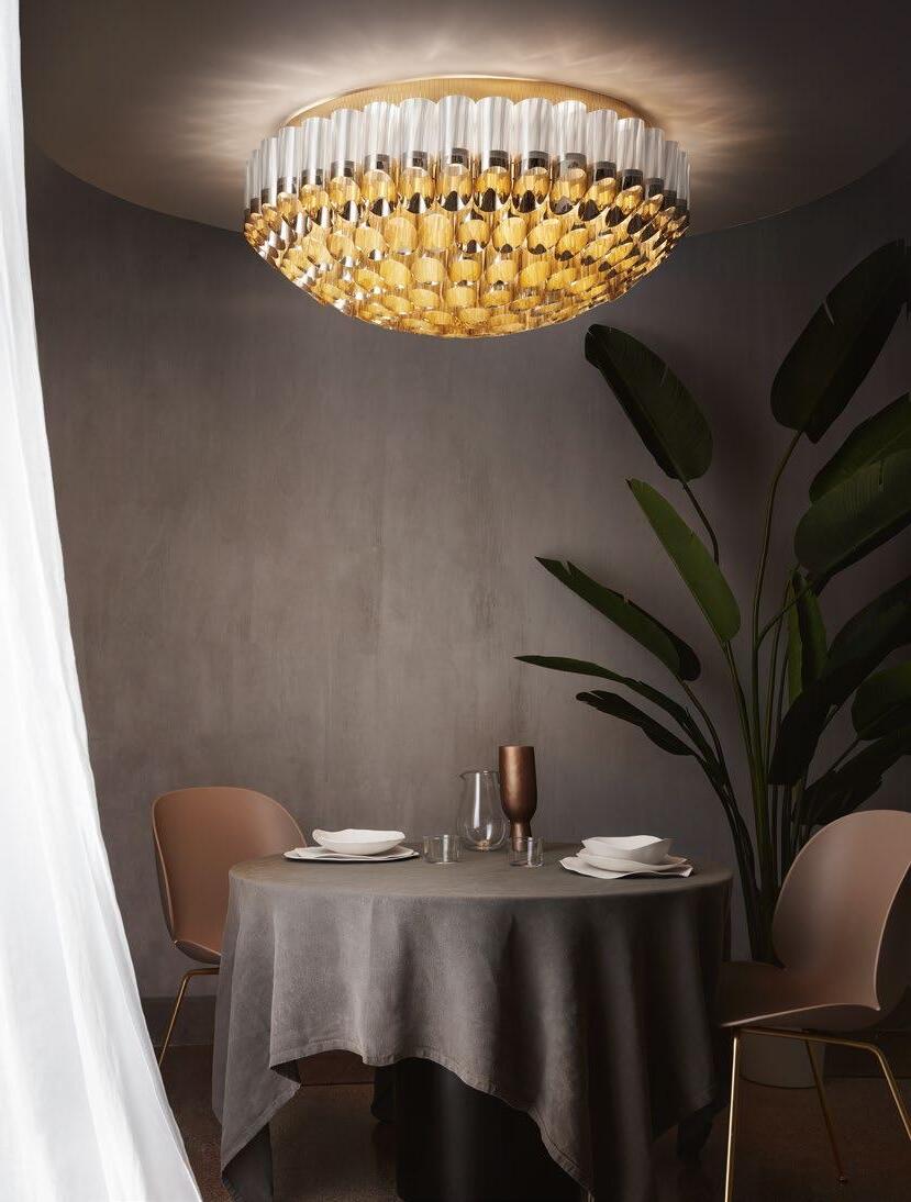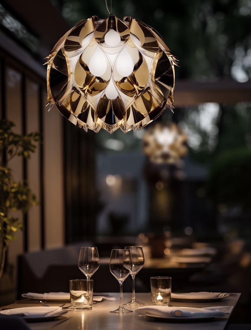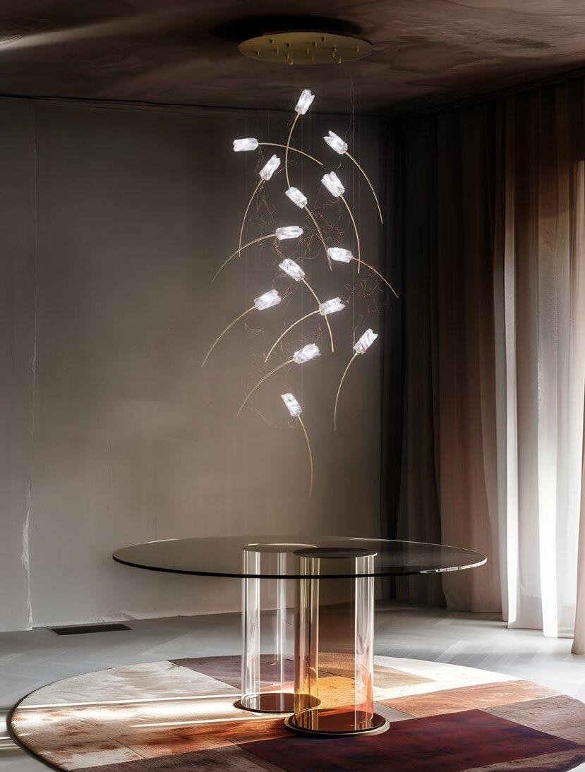 Aria Gold has Cristalflex® arms metallized in a hyperbaric chamber; each piece is cut numerically, wrapped, and placed within the shipping box. Clients can rapidly and intuitively assemble the lamp.